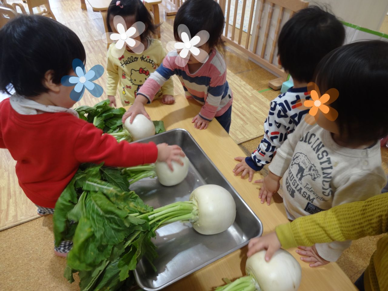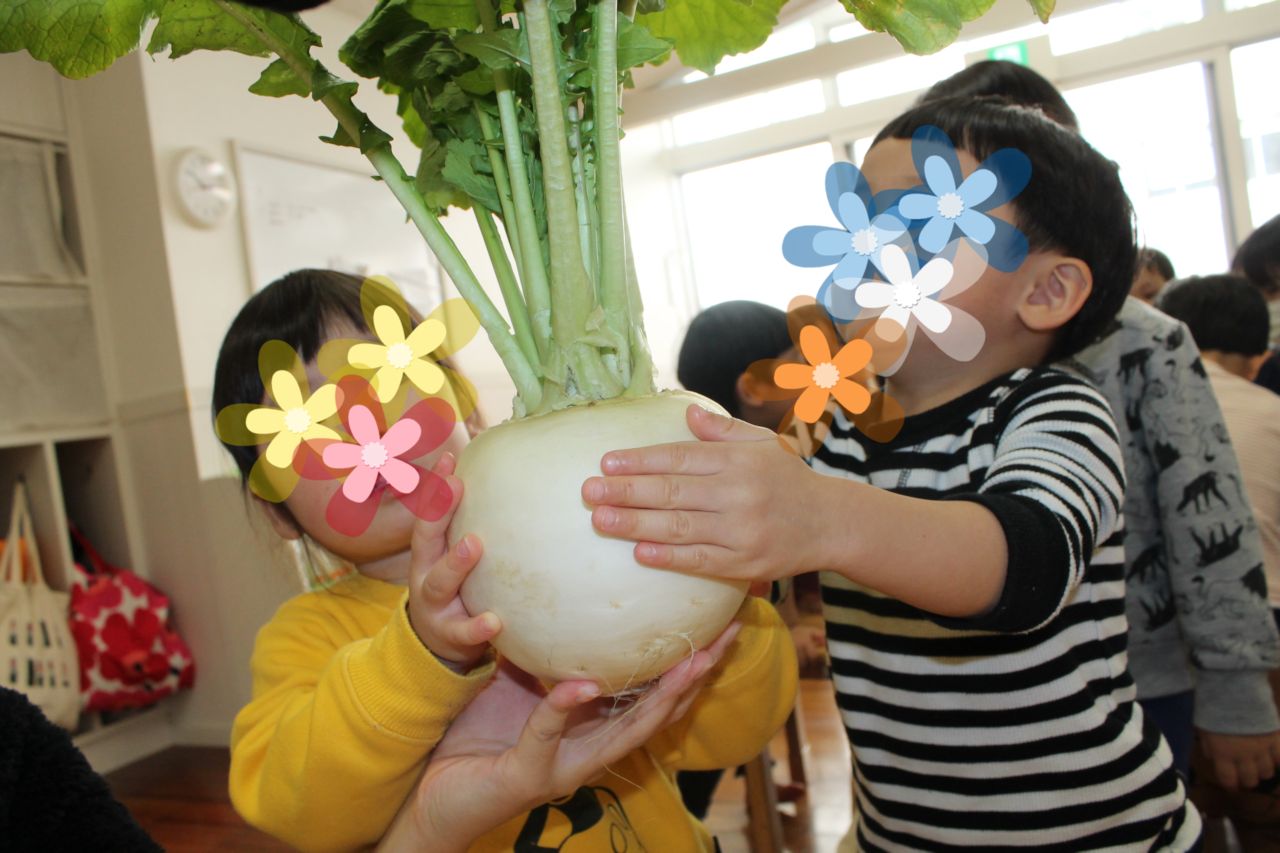 子どもたちは真っ白で真ん丸なかぶを持って見たり、嗅いでみたり・・・興味津々の表情でした。