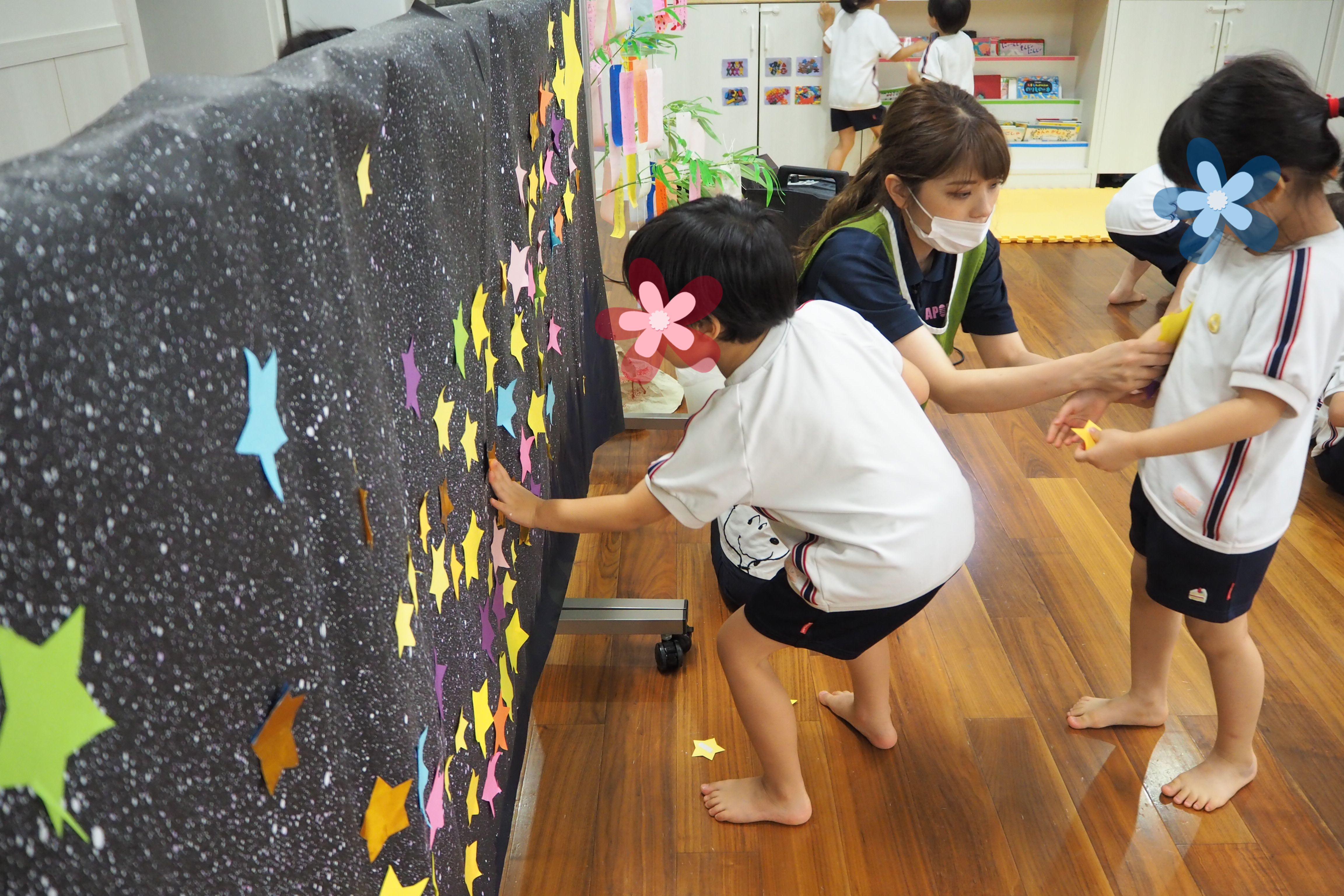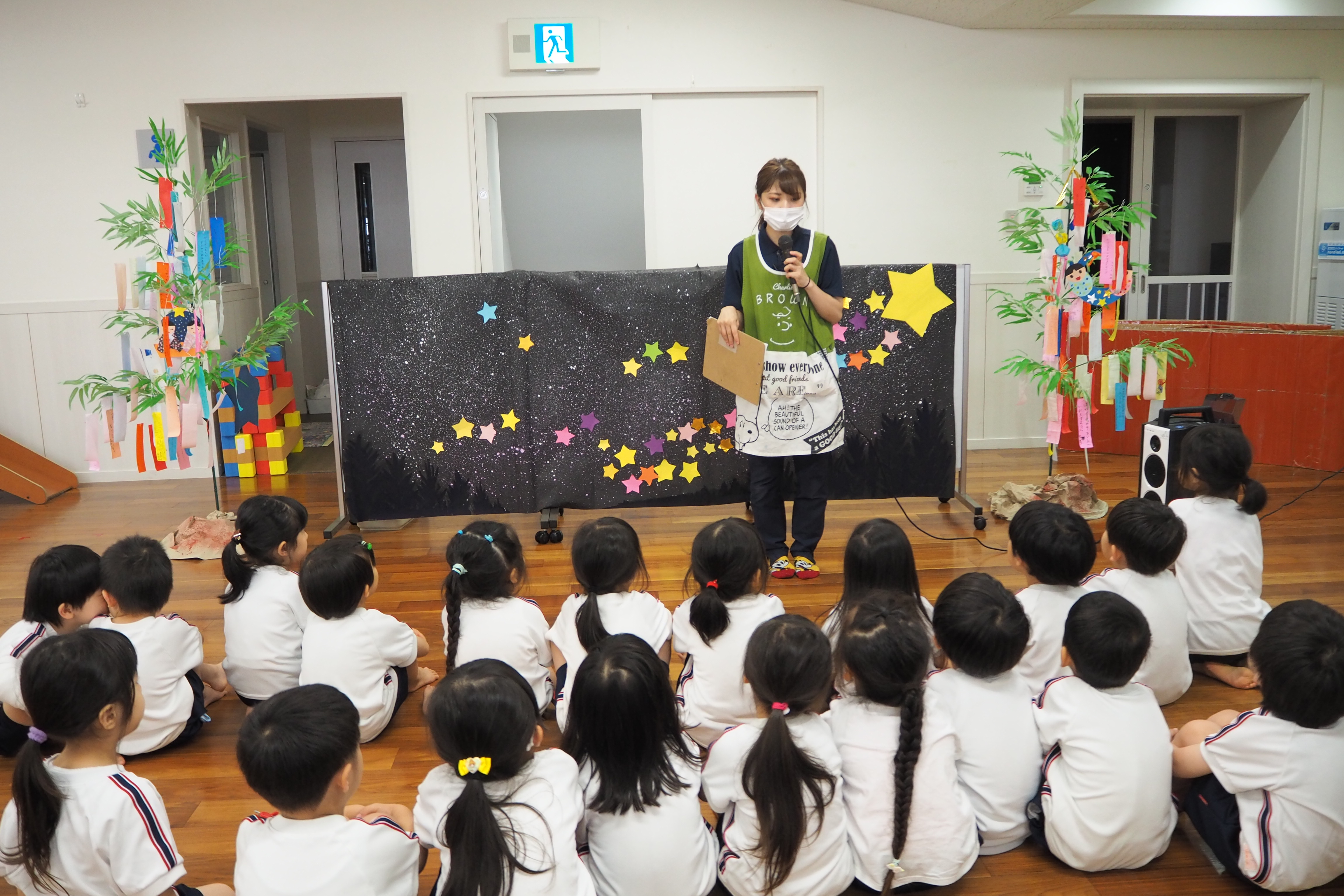 七夕の由来のお話を聞き、ゲームや歌を歌ってみんなで天の川を作りました。