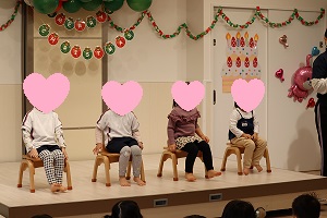 朝からワクワク・ドキドキの子ども達!12月生まれのお友だちは舞台に上がり、恒例の質問タイム!先生からの質問にも元気に答えてくれました😊