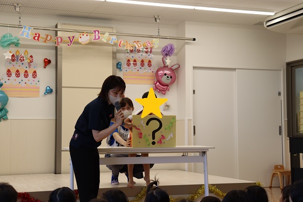 お祝いの後は、「ジュースが🍹が消える」マジックと「箱の中身は何でしょう?」のお楽しみ!お誕生日の主役さん一人一人舞台に上がって、箱の中身を当ててくれました。