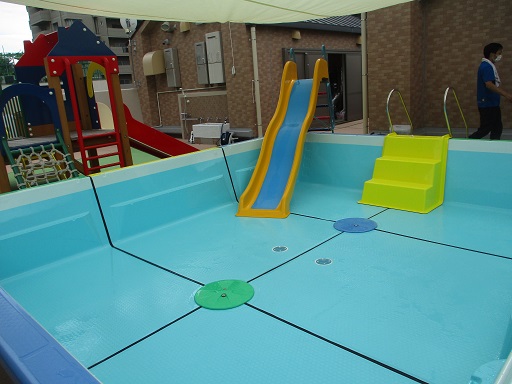 4階の屋上に、今年もプールの設置が完成しました😊25日から、プール遊びが始まります。