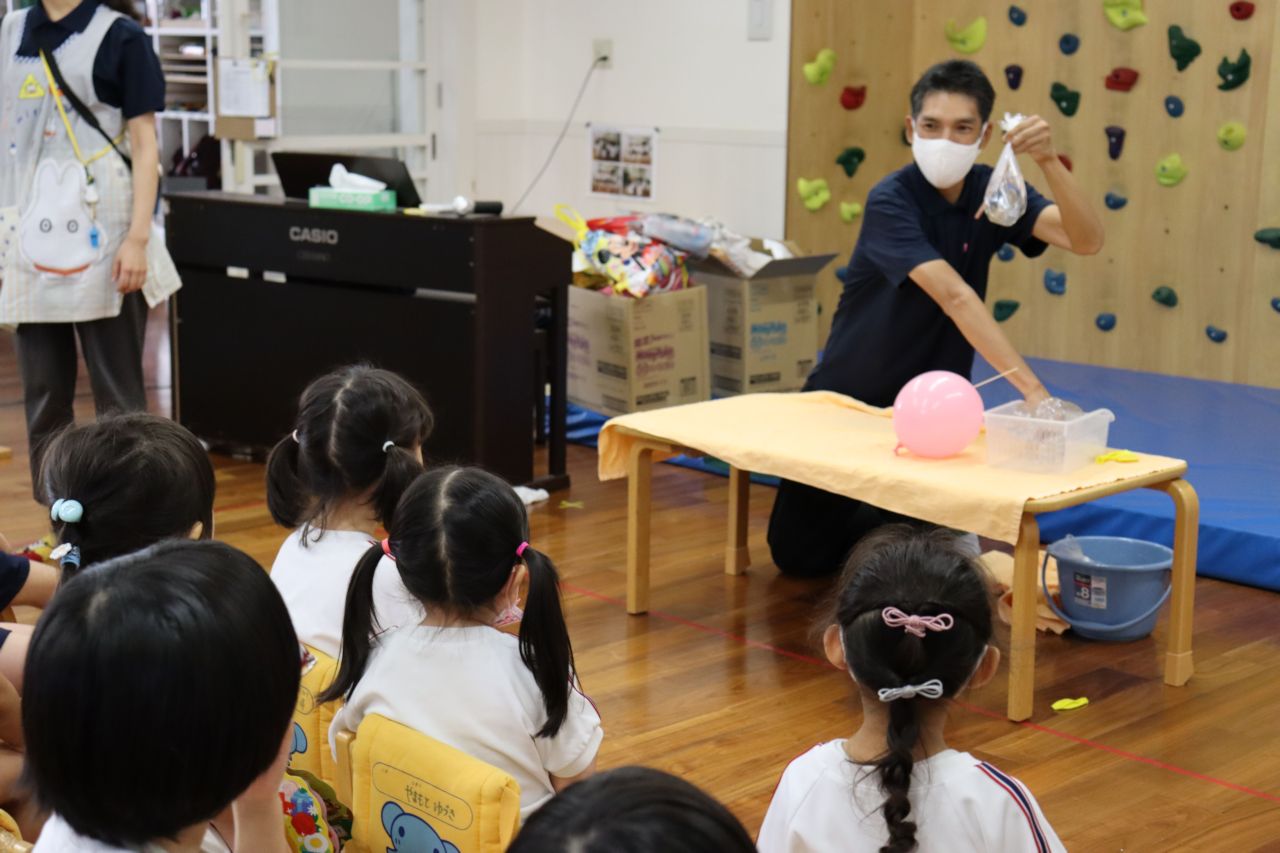 竹串で刺しても割れない風船・逆さにしてもこぼれないコップなど、盛りだくさんで、子ども達の「なんで!?」「どうなってるの!?」がたくさん聞こえてきました。