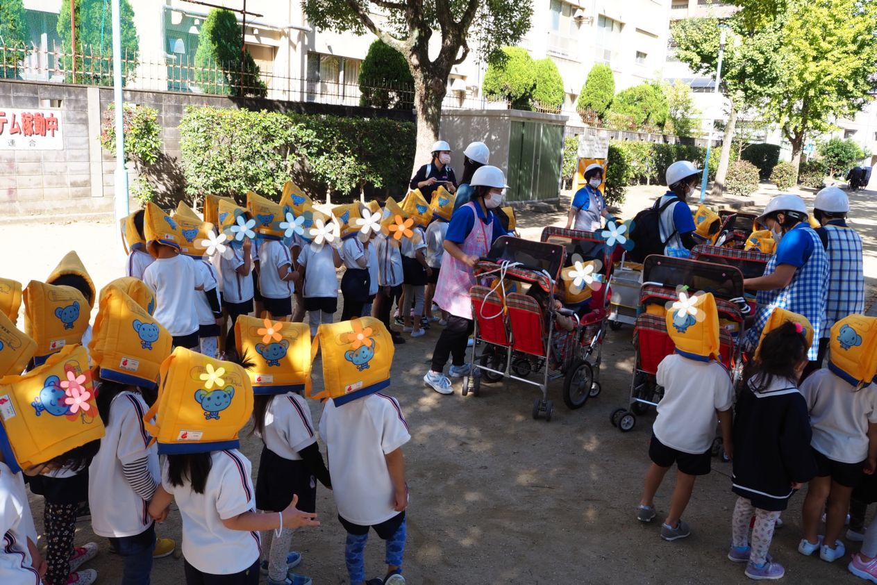 今月は広域避難場所である日吉小学校まで避難することを想定し、お隣の日吉公園まで全体避難を行いました。