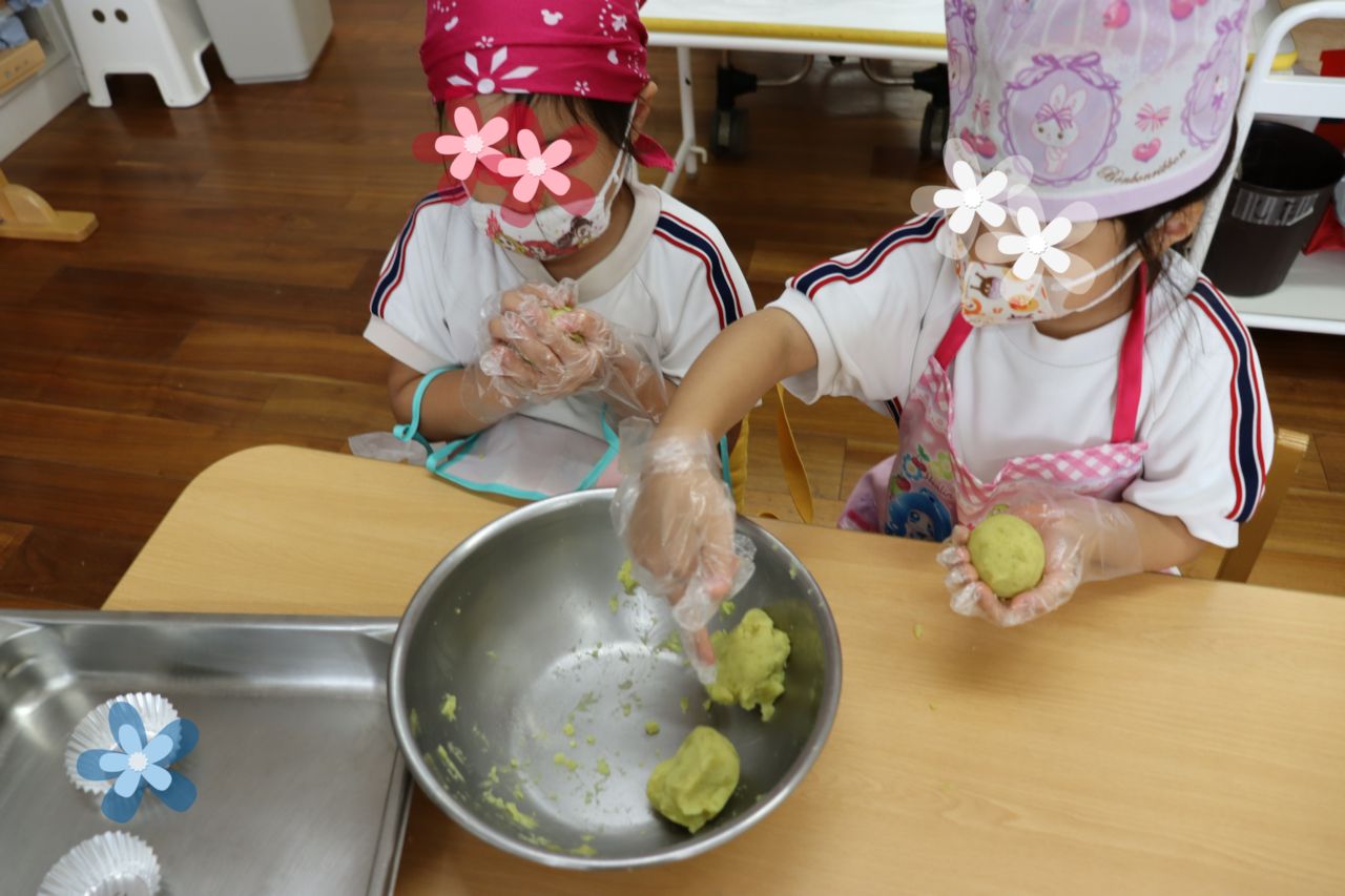 おやつの時間には、あま~い良い香りのするスイートポテトを頬張りながら「おいしい!」「おうちでもつくりたいな~!」と、子どもたち。