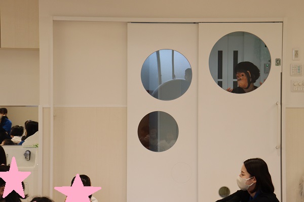 皆から「好きな食べ物は?」「好きな動物は?」「大きくなったら何になりたい?」・・・色々な質問にも堂々と答えてくれた今日の主役さん達😊お歌のプレゼントをもらうと・・・窓の外からのぞいている影が・・・😲