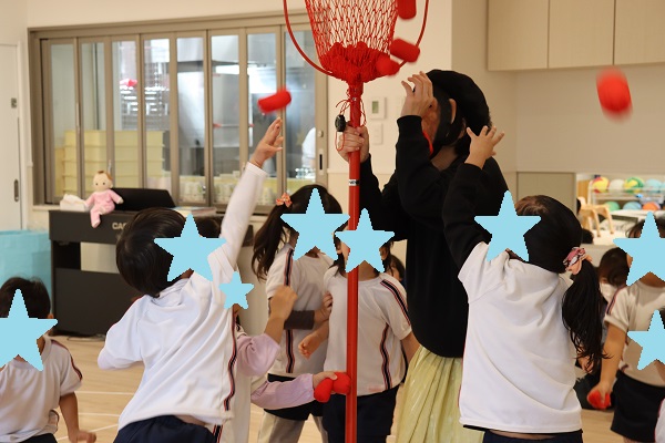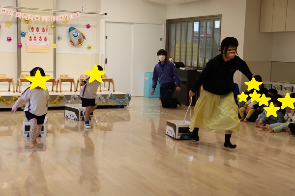 お誕生児さんでオンデマンドバス競争をした後は、虹組vs空組 星組vs月組 で運動会の保護者競技「二刀流でits show time」を楽しみました😊