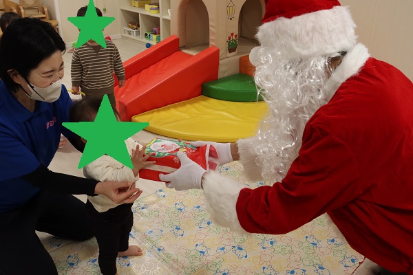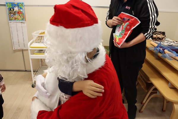 ベランダからサンタさんが入ってくると、大騒ぎ😊大興奮の子ども達。🎅サンタさんにも色々質問したり、皆で記念撮影をしたり、そしてお待ちかねのプレゼントをひとりひとり渡してもらうと、嬉しさのあまり🎅サンタさんにハグするかわいい姿も見られました。