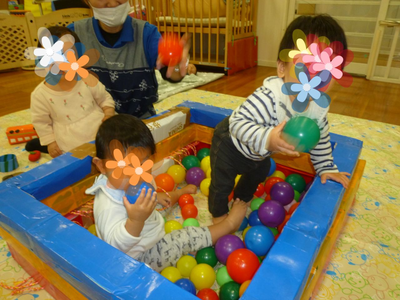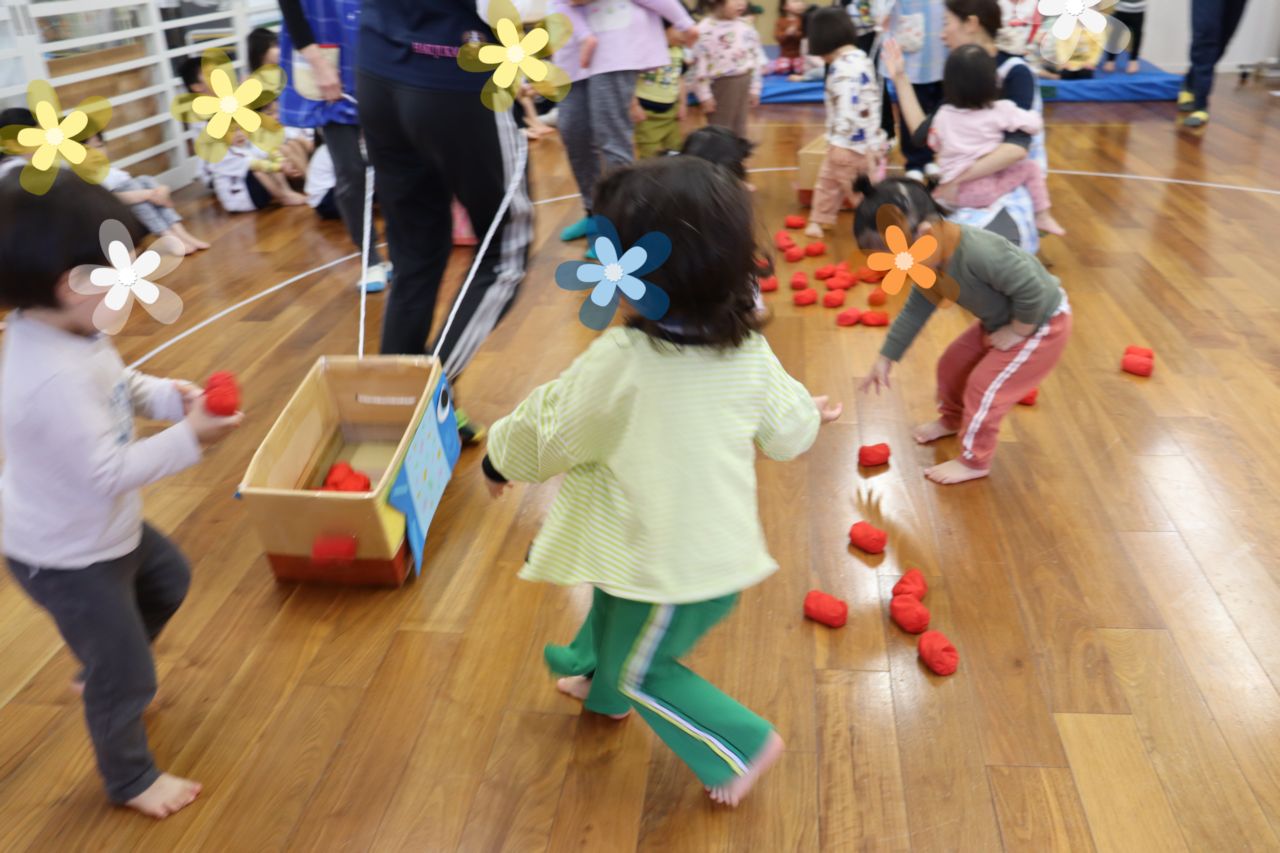 3~5歳児は縦割りでチームに分かれ、いくつ玉が入るか対決しました☆彡