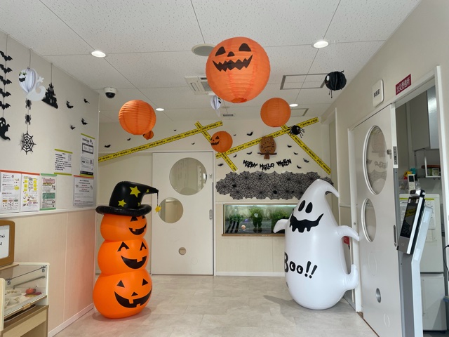 玄関も今日からは、かわいいかぼちゃやおばけ👻がお出迎え😊園外の植木からも、かわいいおばけさん達が覗いていますよ!!