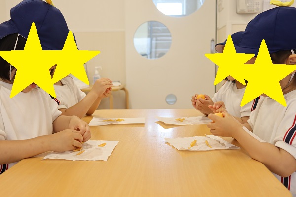 今年は昨年よりもさらに高い位置に実がなったので、収穫は先生がおこないましたが、もちろん試食会は子ども達も・・・・😋