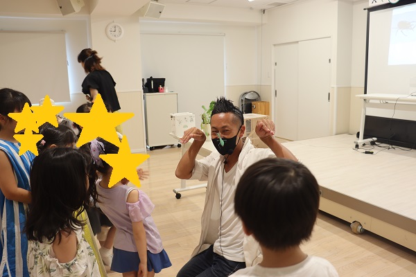 カマキリ博士に来て頂き、夏らしく🍉昆虫の楽しいお話やクイズを楽しんだり、珍しいカマキリや昆虫にも触れて遊ぶことができました。