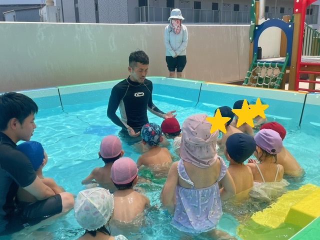 かなり暑い日でプール遊びができるか心配しましたが、早朝から日よけネットを張ったり、水温を調節したり・・・となんとか先生達も子ども達の期待に応えようと奮闘!!