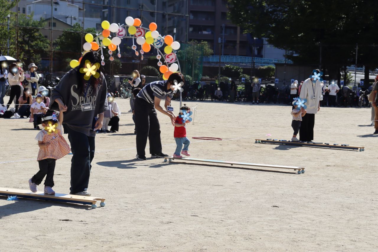 0・1歳児の子どもたちは保護者の方とふれあい競技に参加👟