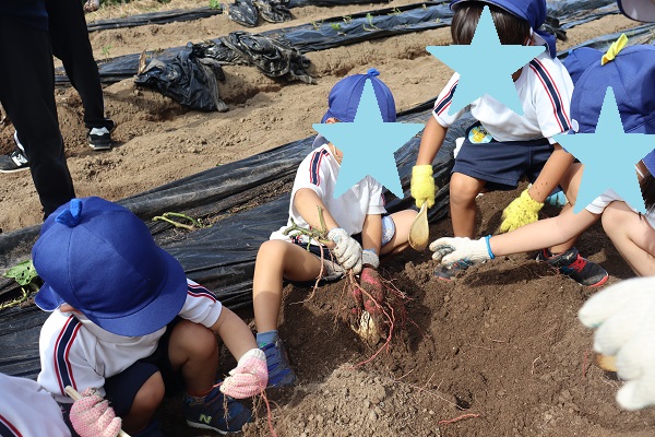 空・星・月組さんで、お芋掘り&みかん狩り遠足に行ってきました。とっても良いお天気で、少し暑いくらいでしたが、午前中は原山公園で走り回ったり、遊具で遊んだり、虫探しをしたり・・・。