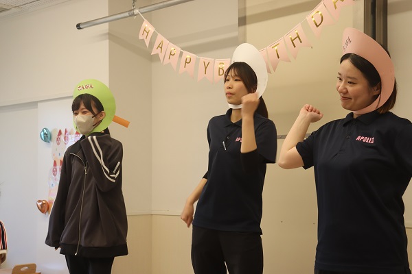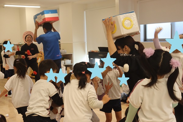各クラス対団子3兄弟で玉入れ競争をして遊びましたよ!!玉入れで負けてしまった団子3兄弟が、兄妹ケンカをし始めてしまいましたが、アポロ鷺洲保育園の子ども達に「仲直り」を教えてもらい、最後は仲良し3兄妹になりました。運動会以降、保護者競技の♪カンカンダンスにハマっている子ども達。ラストは皆でカンカンダンスをして、元気いっぱい・笑顔いっぱいのお誕生日会になりました!!