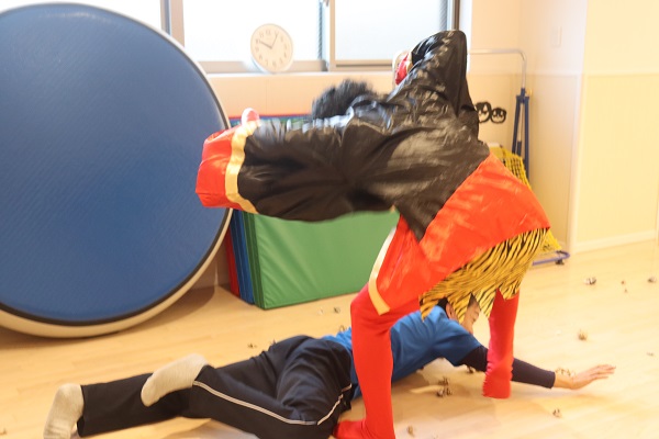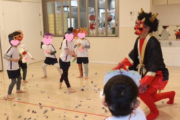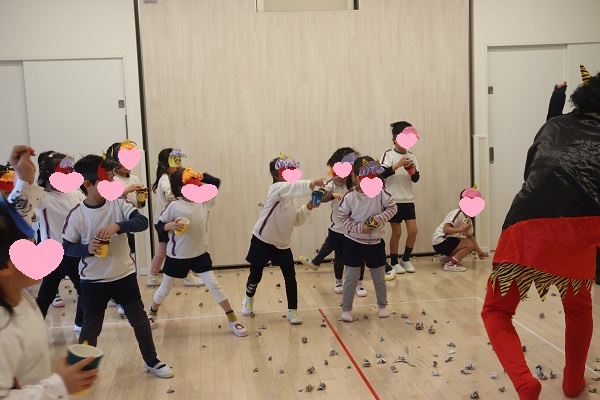 今日は、節分の豆まき(紙を丸めたお豆風です( ´∀` )をしましたよ!!空・星・月組の子ども達は遊戯室でクラスごとにダイナミックな豆まき!!雪・雲・虹組さんは、お部屋にちょこっと鬼さん登場!!