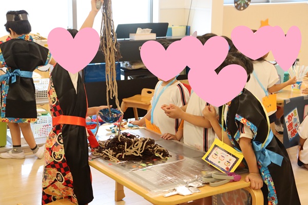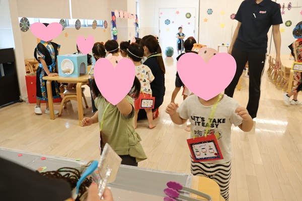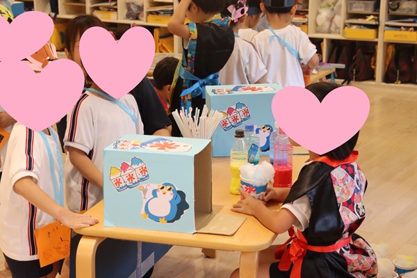 かき氷・焼きそば・フルーツ飴・ワニワニパニック・スイカ割りのお店番を月組の子ども達にしてもらい、夏ならではのおまつりをみんなで楽しみました😊