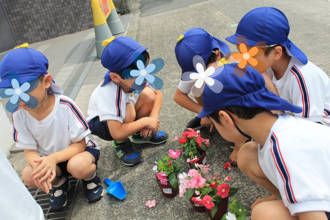 月組が園の前のプランターに花の苗を植えました。