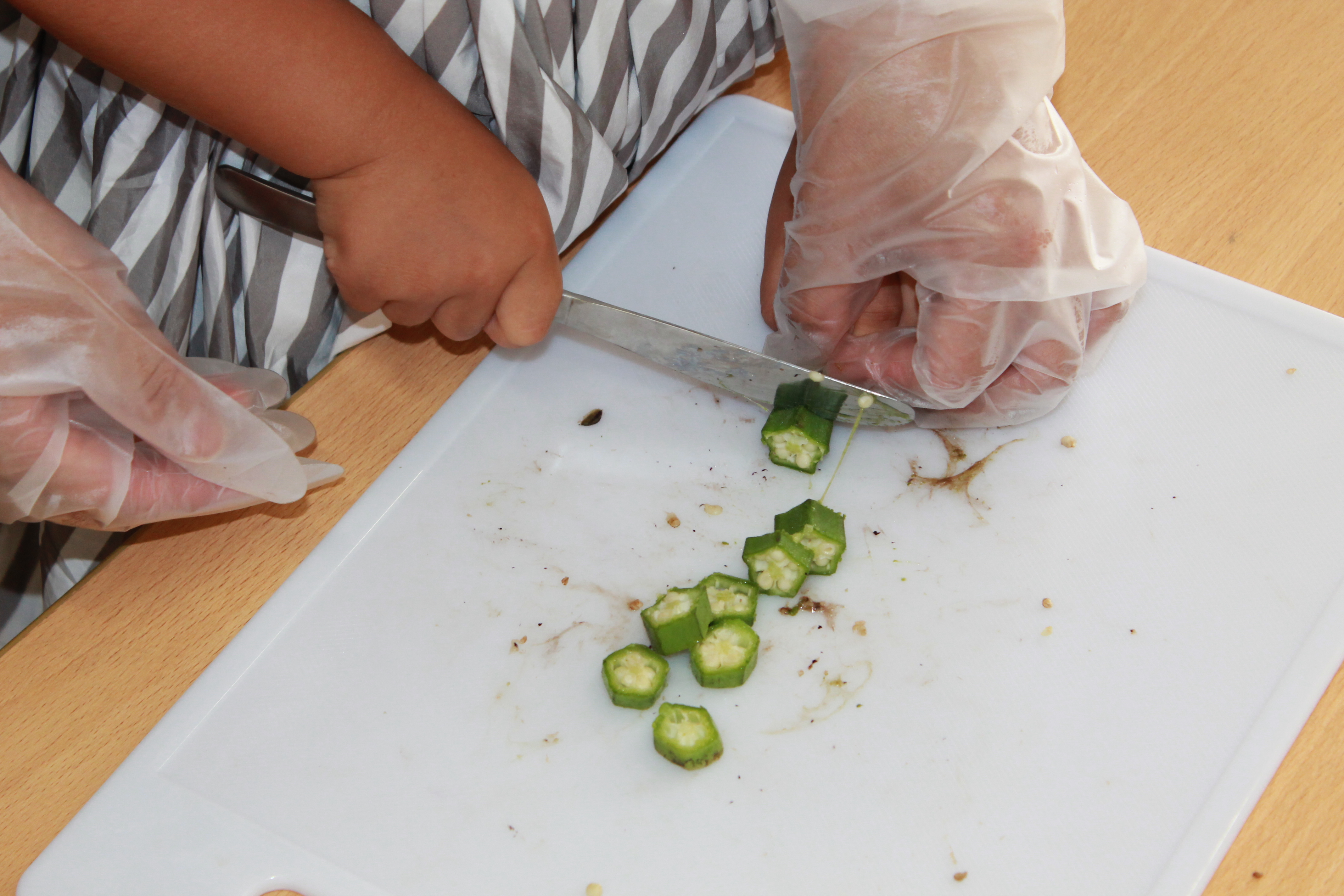 切るときの注意をしっかりと守りながら、そーっとナイフを持ち真剣な表情で食材を切っていきます。