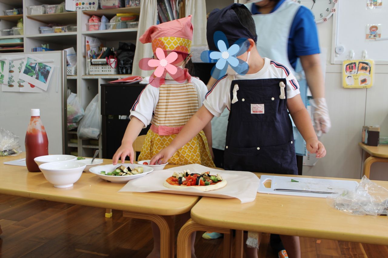 「おいしくなぁれ!」の気持ちを込めて、野菜とチーズをトッピングして出来上がり。